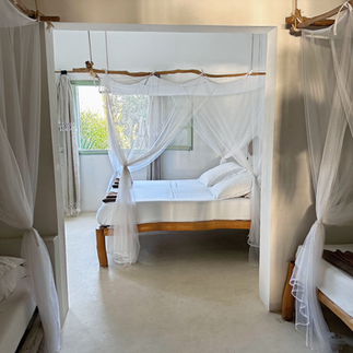 Cette chambre accueillante offre un accès direct sur la fraîcheur du jardin et la plage à deux pas. Idéale pour une famille ou un groupe jusqu’à quatre personnes, elle dispose d’un lit double et de deux lits simples, chacun équipé d’une moustiquaire pour des nuits paisibles. La chambre comprend également une salle de bain privative avec douche et WC, ainsi que des ventilateurs. Un cadre simple et reposant, parfait pour profiter d’un séjour détendu au cœur de la nature.